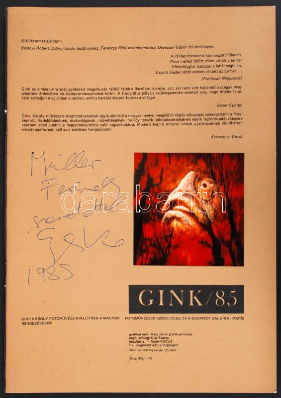 1985 Gink Károly (1922-2002) fotóművész dedikációjával és egy vintage fotóval ellátott kiállítási katalógus, hozzáadva egy róla készült portré és a kiállítás meghívója