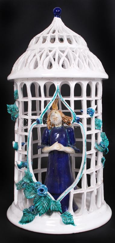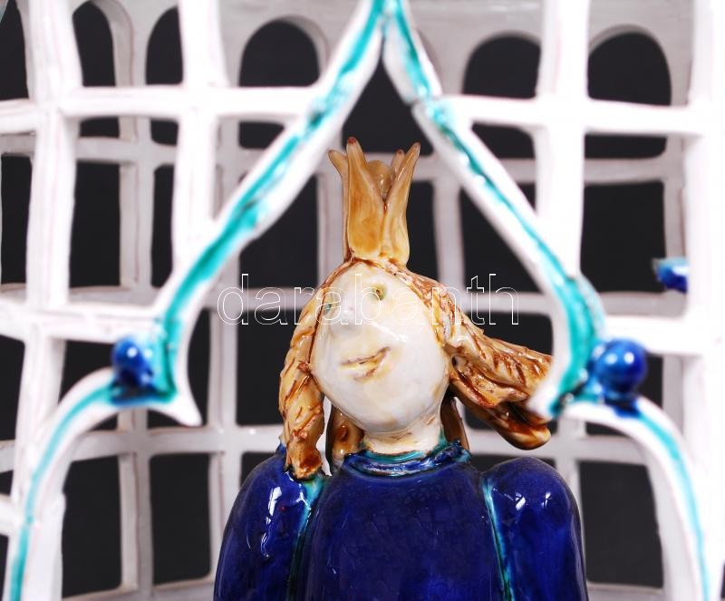 Leírás: Morvay Zsuzsa (1946-): Királynő a kalitkában. Mázas kerámia, jelzett, hibátlan, m:46 cm, d:21 cm