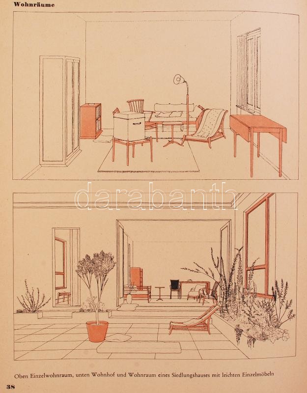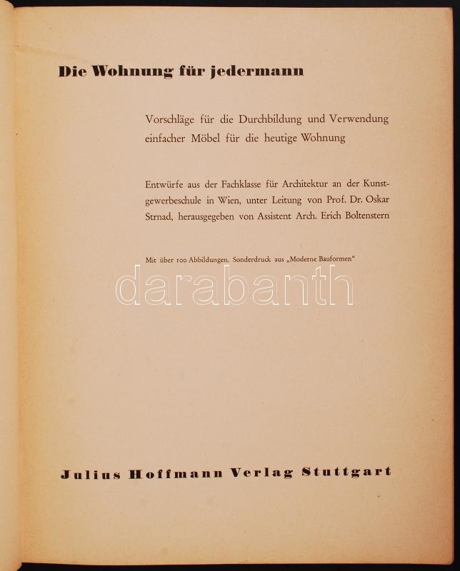 Die Wohnung für jedermann. Vorschläge für die durchbildung und Verwendung einfacher Mübel für die heutige Wohnung. Hrsg. Assistent Arch. Erich Boltenstern. Mit über 100 Abbildungen. Sonderdruck aus "Moderne Bauformen". Stuttgart, 1933, Julius Hoffmann Verlag. Belsőépítészeti album rengeteg tervrajzzal, kiadói papírkötésben /