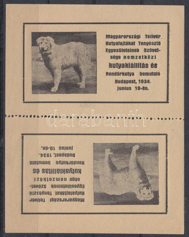 Leírás: 1934 Magyarországi Telivér kutyakiállítás fordított levélzáró pár