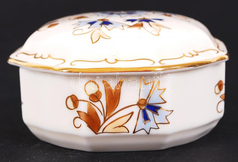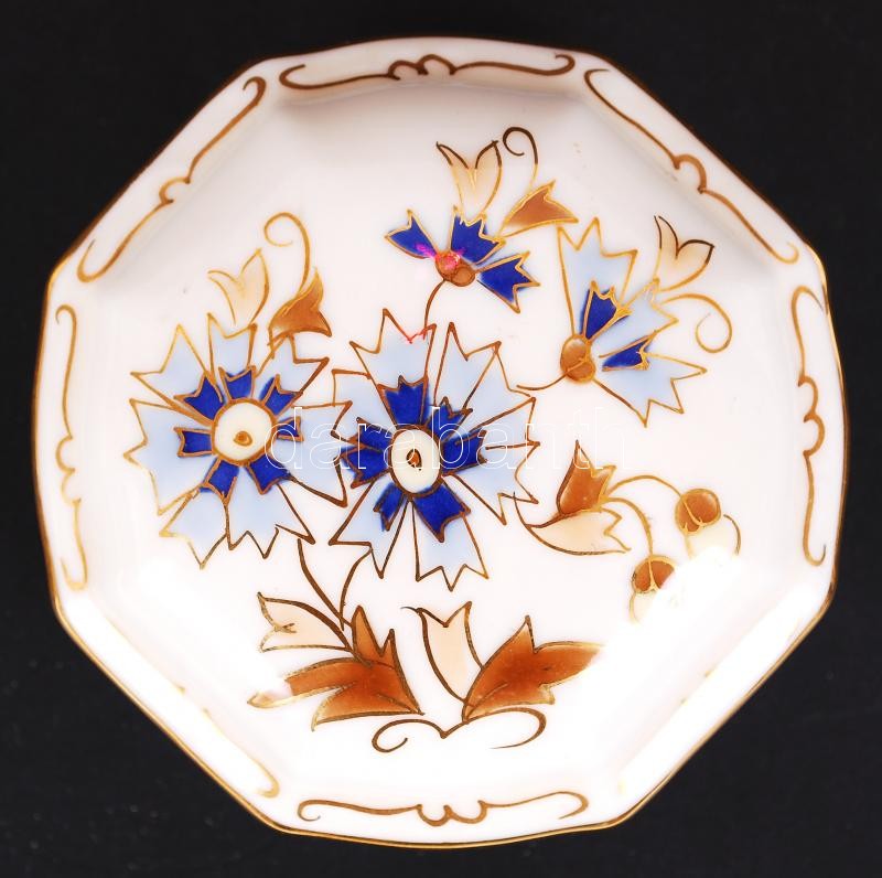 Leírás: Zsolnay búzavirág mintás ékszeres dobozka, kézzel festett, jelzett, hibátlan, d:8 cm