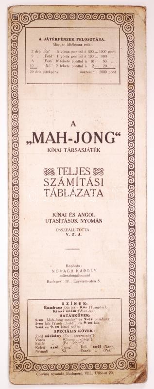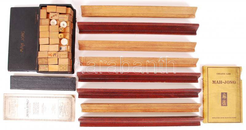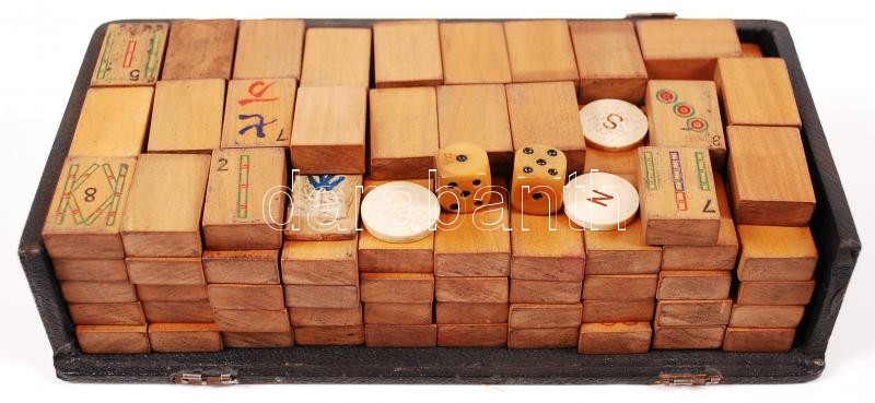 Cca 1930 Mah-Jong, felnőtt társasjáték, majdnem teljes, játszható állapotban, doboza sérült,plusz tartókkal, magyarázó kis könyvvel, számítási füzettel, 38×20 cm