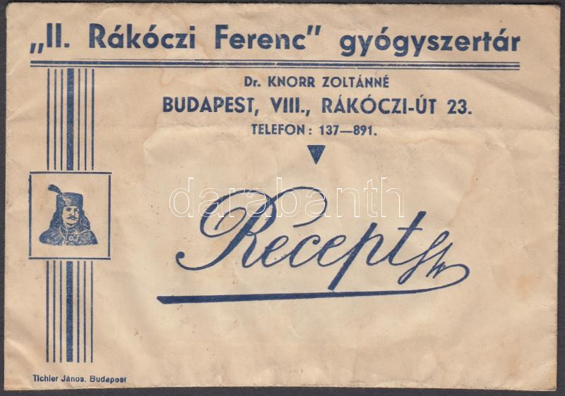 cca 1910 Bp. VIII. Receptboríték: "II. Rákóczi Ferenc" gyógyszertár https://www.darabanth.com/hu/191-Gyorsarveres/191.0/Festmeny-mutargy-papirregiseg-egyeb/Reklam~600036/cca-1910-Bp-VIII-Receptboritek-II-Rakoczi-Ferenc-gyogyszertar~II722238