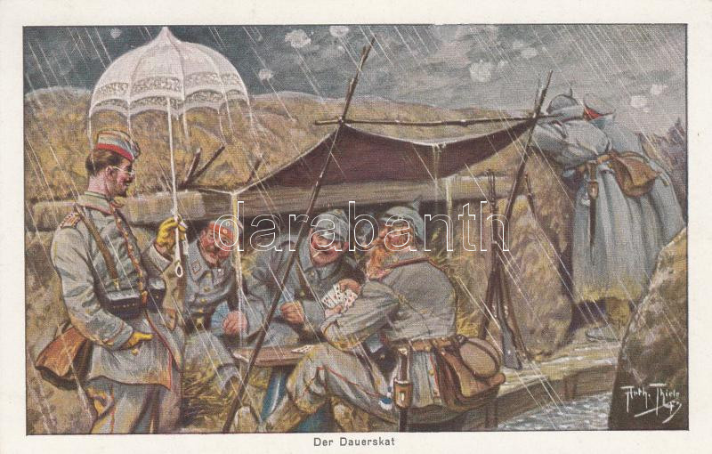 Dauerskat, military humour, s: Arthur Thiele https://www.darabanth.com/hu/191-Gyorsarveres/191.0/Kepeslapok/Katonai~600094/Dauerskat-military-humour-s-Arthur-Thiele~II718773