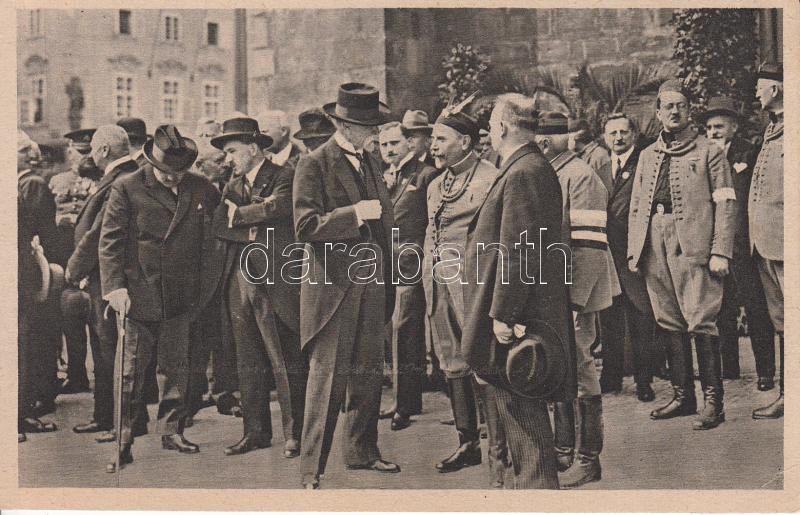 Leírás: 1926 Sokol Meeting, Praha - President Masaryk, Sokol chairman Dr. Schneider and Praha mayor Dr. Baxa; with J. Cerny, E. Benes, Dr. Slávik