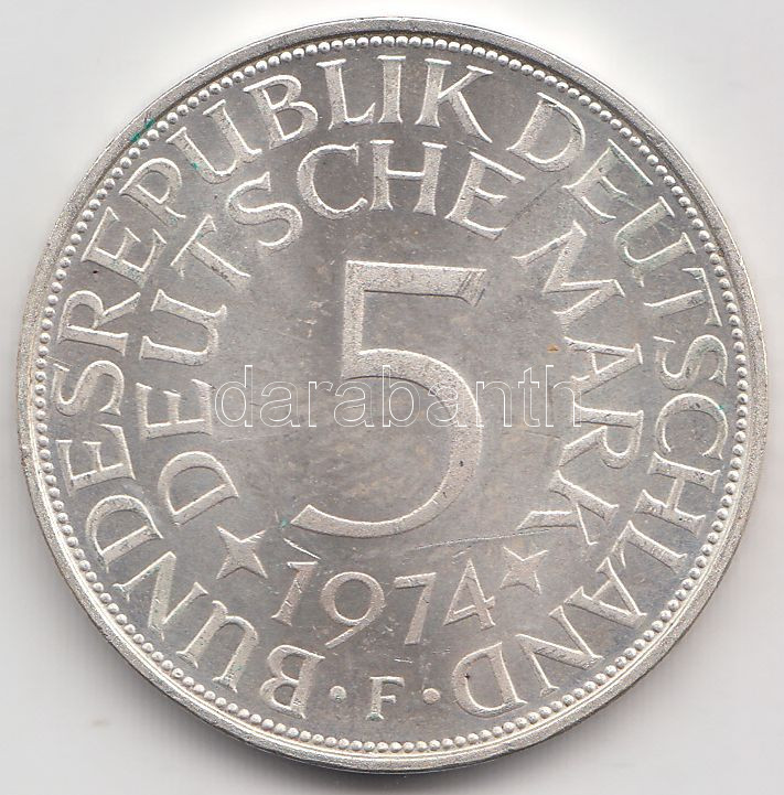 GFR 1974F 5 Mark Ag C:AU https://www.darabanth.com/hu/191-Gyorsarveres/191.0/Numizmatika/Kulfoldi-fem-es-ezustpenzek~200014/NSZK-1974F-5M-Ag-T1--3Cbr3EGFR-1974F-5-Mark-Ag-CAU~II723591