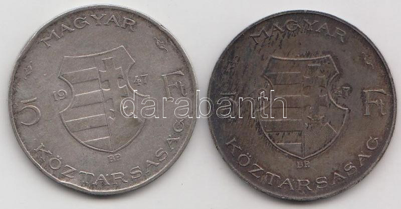 1947. 5Ft Ag "Kossuth" (2x) T:2-,3 https://www.darabanth.com/hu/191-Gyorsarveres/191.0/Numizmatika/Magyar-fem-es-ezustpenzek~200010/1947-5Ft-Ag-Kossuth-2x-T2-3~II720162
