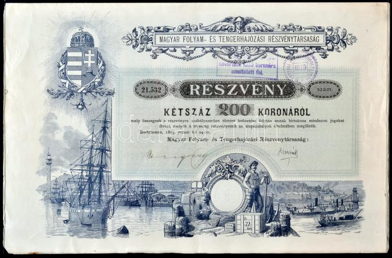 Budapest 1895. "Magyar Folyam- és Tengerhajózási Részvénytársaság" részvénye 200K-ról szelvényekkel és elővételi jog gyakorlásáról szóló pecséttel T:II