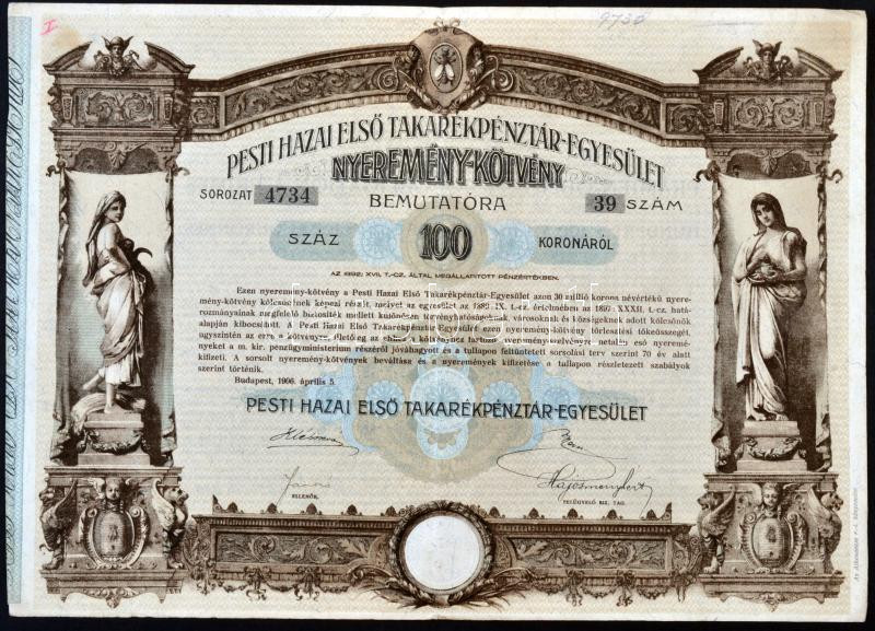 Budapest 1906. "Pesti Hazai Első Takarékpénztár-Egyesület Nyeremény-Kö... https://www.darabanth.com/hu/191-Gyorsarveres/191.0/Numizmatika/Reszvenyek-es-sorsjegyek~200005/Budapest-1906-Pesti-Hazai-Elso-Takarekpenztar-Egyesulet-Nyeremeny-Kotveny-bemutatora-100K~II675445