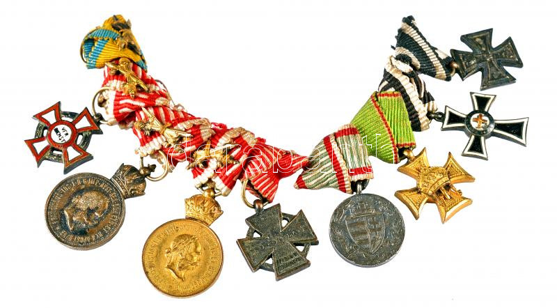 1800-as évek végétől kitüntetés miniatűrök háromszögletű szalagon, összevarrva: "Katonai Érdemkereszt III. osztálya hadidíszítménnyel és kardokkal" + ~1914. "Bronz Katonai Érdemérem a katonai érdemkereszt szalagján kardokkal" (2x) + "Károly-Csapatkereszt" + "Magyar Háborús Emlékérem kardokkal,sisakkal" + "III. Osztályú Tiszti Szolgálati Jel zöld szalagon" + "Német Lovagrend Mária Keresztje (Marianus Kereszt)" + Porosz 1870. Vaskereszt háromszögletű szalagon + Vaskorona Rend III. osztálya hadidíszítménnyel és kardokkal kitüntetés miniatűrjének csak a szalagja T:2