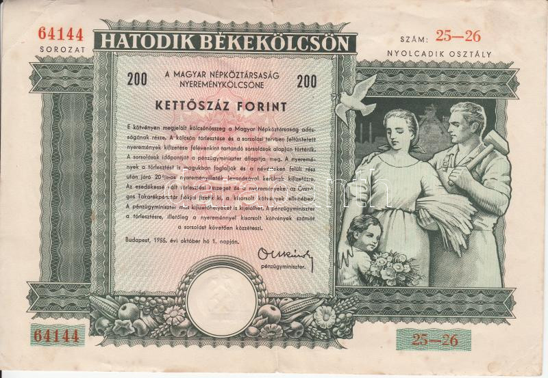 Leírás: Budapest 1955. "Hatodik Békekölcsön" nyereménykölcsöne 200Ft-ról T:III