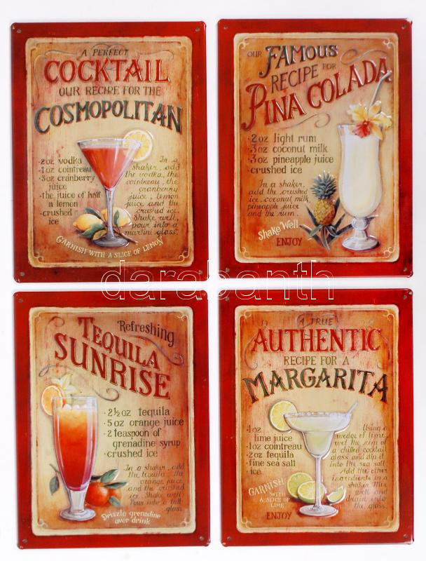Leírás: Dombornyomott lemezkép különféle italokról, koktélokról, fém, összesen: 4db, 20×05 cm