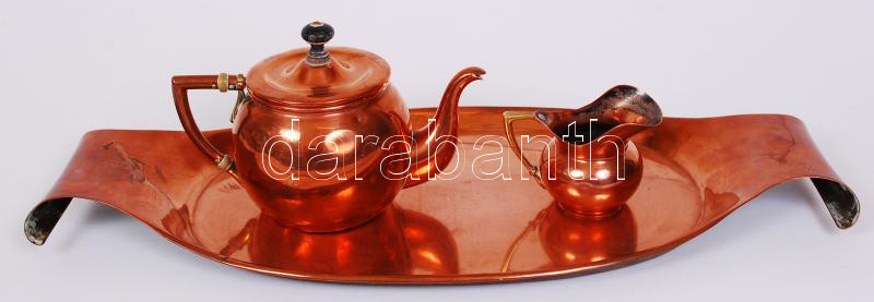 Leírás: Vörösréz jugendstil teáskanna, tejkiöntő és tálca /