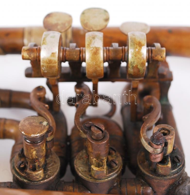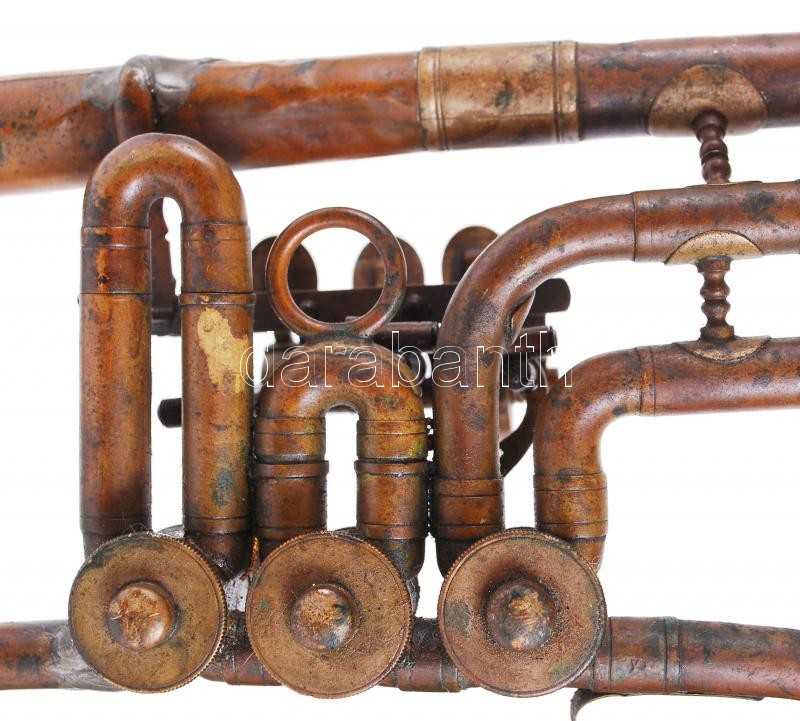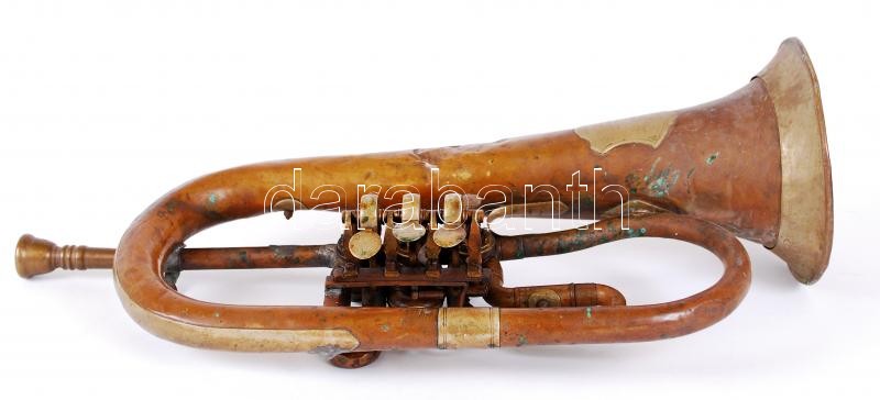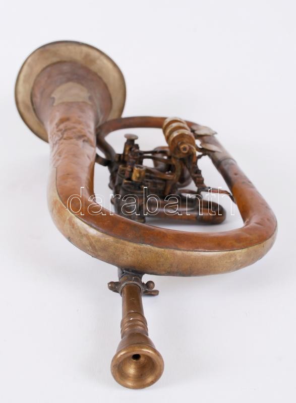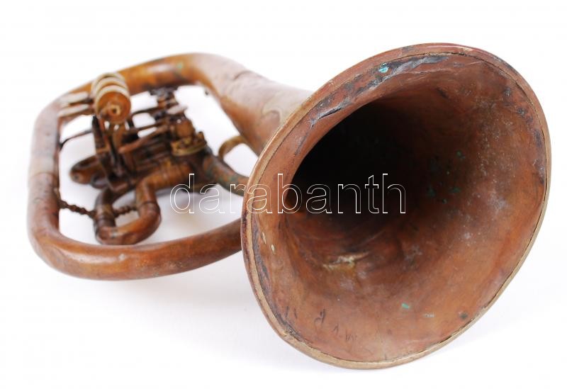 Leírás: cca 1890 "Stowasser J.[ános] m. királyi udvari hangszergyár Budapest" szárnykürt, javításra szorul /