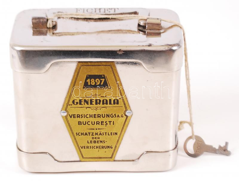cca 1910 "Generala" Versicherungs A.G. Bucuresti, fém persel... https://www.darabanth.com/hu/193-Gyorsarveres/193.0/Festmeny-mutargy-papirregiseg-egyeb/Bolhapiac~200011/cca-1910-Generala-Versicherungs-AG-Bucuresti-fem-persely-kulccsal--3Cbr3EGenerala-Versicher~II735841