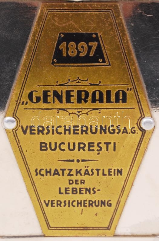 Leírás: cca 1910 "Generala" Versicherungs A.G. Bucuresti, fém persely kulccsal /