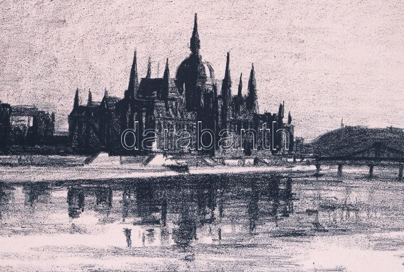 Leírás: Ék Sándor (1902-1975):Országház a Margit-híd felől. Litográfia, papír, jelzett, 50×70 cm
