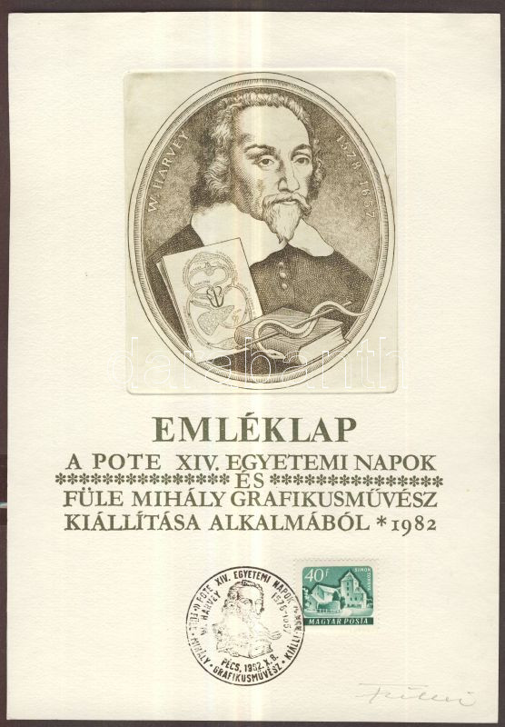 Leírás: Füle Mihály: W. Harvey, rézkarc-papír, jelzett kis szériás emléklapon alkalmi bélyegzéssel 15x21 cm