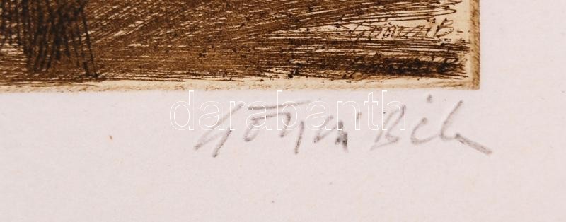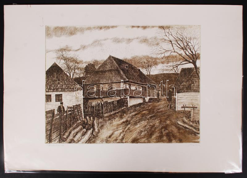 Leírás: Gönczi Béla (1934-): Telekfalva. Rézkarc, papír, jelzett, 29×39 cm