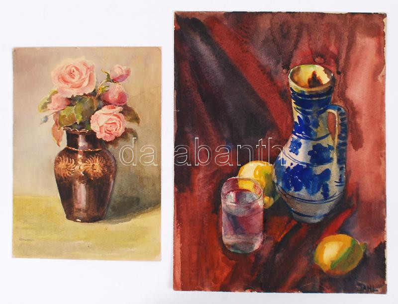 Leírás: Ismeretlen jelzéssel: 2db csendélet. Akvarell, papír, 39,5x30cm, 30,5x21,5cm