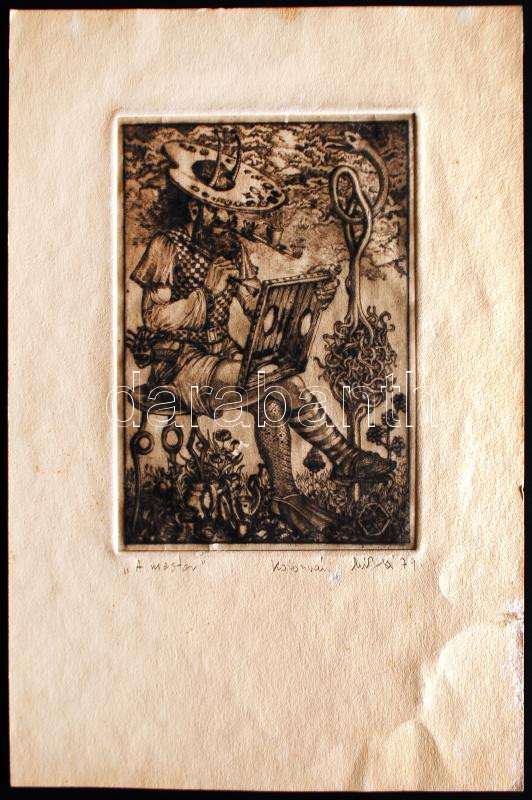 Leírás: Kolozsvári G. Miklós (1950-): A mester. Rézkarc, foltos, papír, jelzett, 13×9 cm