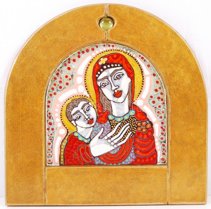 Leírás: Radnai Zoltán (1960-): Mária a kis Jézussal. Tűzzománc, 15×15 cm, igényes keretben 25×25 cm