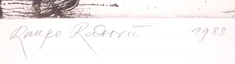 Leírás: Ranko Radović (1935-2006) The Knight on the Road. Rézkarc 62/90, papír, jelzett, üvegezett keretben 80×60 cm