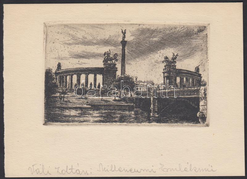 Váli Zoltán (1910): Milleniumi emlékmű. Rézkarc, papír, jelzés nélkül,... https://www.darabanth.com/hu/193-Gyorsarveres/193.0/Festmeny-mutargy-papirregiseg-egyeb/Festmenyek-es-grafikak~200001/Vali-Zoltan-1910-Milleniumi-emlekmu-Rezkarc-papir-jelzes-nelkul-11x15cm~II734513