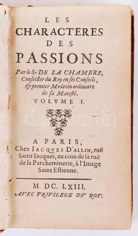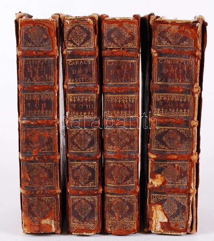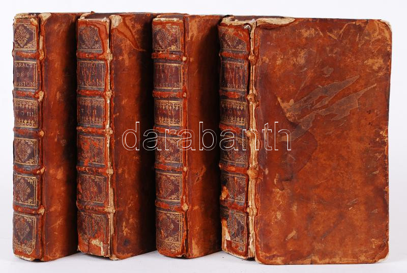 Marin Cureau de La Chambre: Les characteres des passions I., III-V. Paris, 1658, Jacques d'Allin. Korabeli, aranyozott, bordázott gerincű, egészbőr kötésben, aranyozott élmetszéssel, kopottas állapotú (a II. kötet hiányzik!) /
