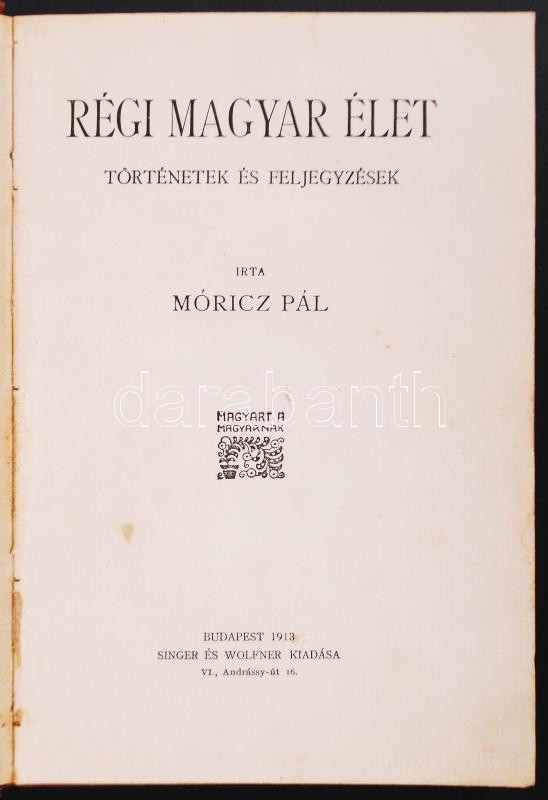 Móricz Pál: Régi magyar élet. Történetek és feljegyzések. Bp., 1913, S... https://www.darabanth.com/hu/193-Gyorsarveres/193.0/Festmeny-mutargy-papirregiseg-egyeb/Konyvek-Egyeb-ritkasagok~200039/Moricz-Pal-Regi-magyar-elet-Tortenetek-es-feljegyzesek-Bp-1913-Singer-es-Wolfner-Uj~II735738