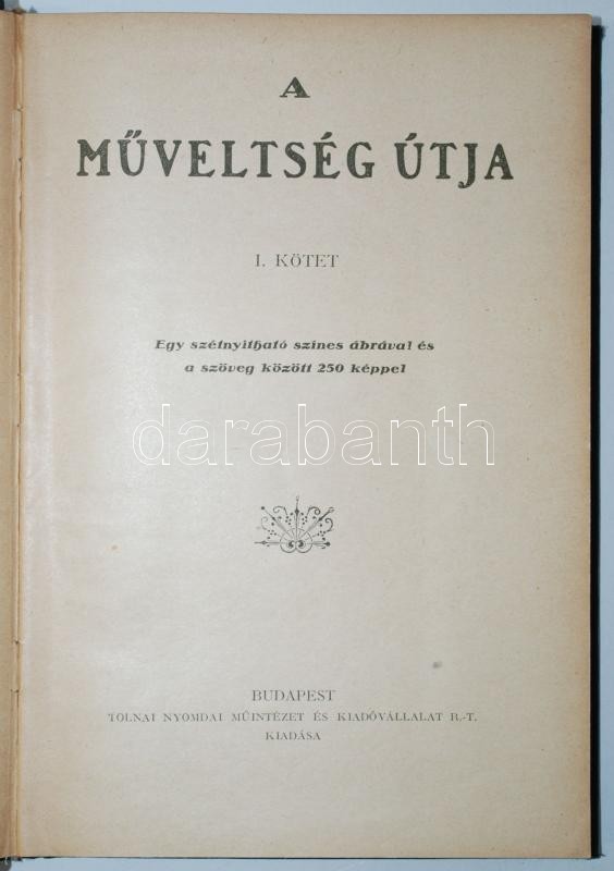 Tolnai: A Műveltség útja I. kötet kiváló állapotban, szétnyitható színes ábrával és rengeteg szöveg közötti képpel, kiadói aranyozott egészvászon kötésben