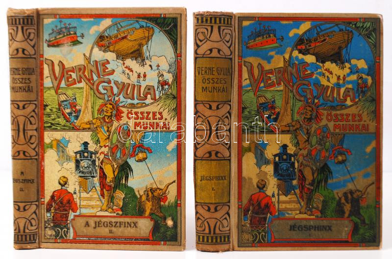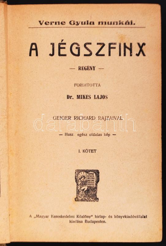 Verne Gyula: A jégszfinx I-II. Ford. dr. Mikes Lajos. Geiger Richard rajzaival. (Verne Gyula Összes Munkái) Bp., é.n., "Magyar Kereskedelmi Közlöny". 40 egész oldalas képpel illusztrált, kiadói, festett, egészvászon kötésben (gerincén és a II. kötet elülső kötéstábláján sérülés)
