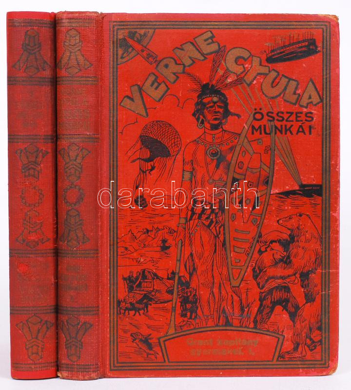 Verne Gyula: Grant kapitány gyermekei I-II. Ford. Dr. Mikes Lajos. Geiger Richárd rajzaival. Husz egész oldalas kép. (Verne Gyula Összes Munkái) Bp., é.n., Tolnai. Kiadói, festett félvászon kötésben (a második kötet az eredeti felhasználásával újrakötve)