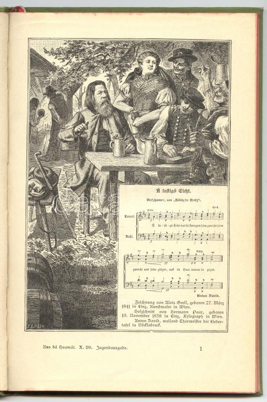 Aus da Hoamat X. Jugendausgabe ausgewählter oberösterreichischer mundartlicher Dichtungen. Hrsg. Zötl-Matosch-Commenda, der musikalische Theil durchgesehen von Ludwig Zöhrer. Linz, 1898-1899, Im Selbstverlage der Herausgeber als Stelzhamer-Bund. Kiadói, festett egészvászon kötésben, metszetekkel illusztrált, jó állapotú