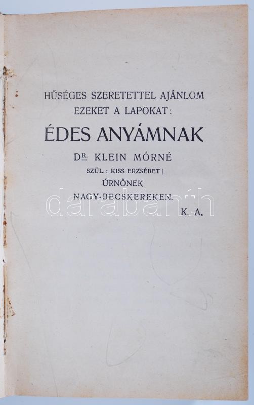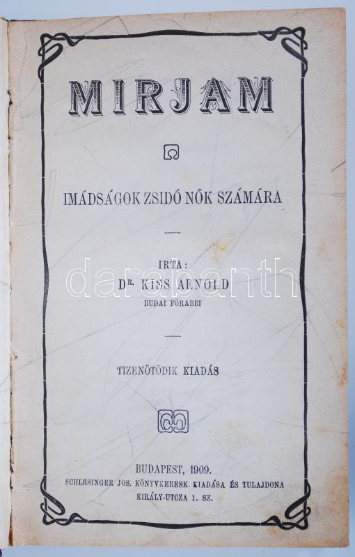 Dr. Kiss Arnold: Mirjam. Imádságok zsidó nők számára. Bp., 1909, Schlesinger Jos. Kiadói egészvászon kötésben, kissé viseltes (a védőlapok és az előzéklap kitépve, több helyen ceruzás firkák)