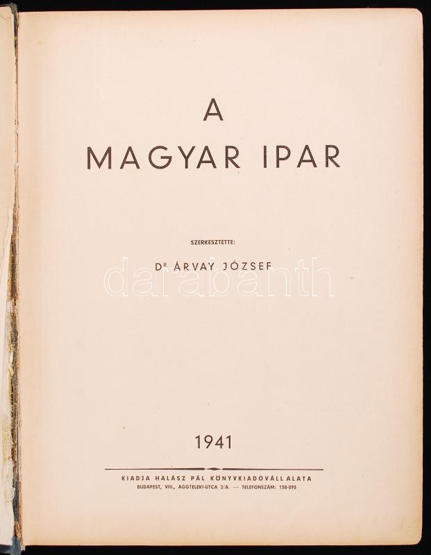A Magyar Ipar. Szerkesztette: Dr. Árvay József. Kiadja Halász Pál könyvkiadó vállalata, Budapest, 1941. Borító kissé kopott, első néhány lap kiszakadva, aranyozott egészvászon kötésben.