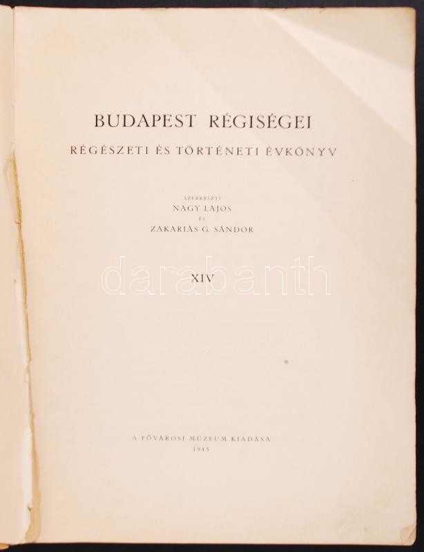 Budapest régiségei. Régészeti és történeti évkönyv XIV. Szerk. Nagy Lajos - Zakariás G. Sándor. Bp., 1945, Fővárosi Múzeum. Kiadói papírkötés, viseltes állapotú