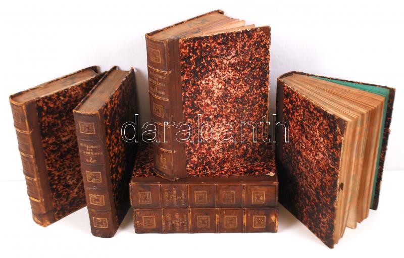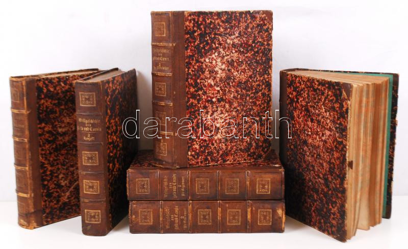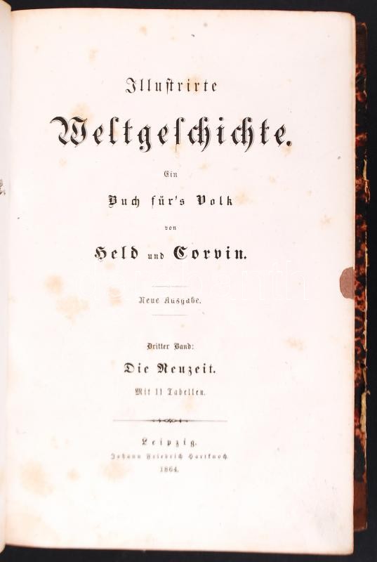 Held, Friedrich Wilhelm Alexander - Corvin, Otto von: Illustrierte Weltgeschichte. Ein Buch für's Volk von Held und Corvin. I-IV. (in 6 Bde.: Alterthum, Mittelalter, Neuzeit 1-2., Gegenwart 1-2.) Neue Ausgabe. Mit Tabellen und Karten. Leipzig, 1864, Johann Friedrich Hartknoch. Korabeli félbőr kötésben, márványozott lapszélekkel, a táblázatok és térképmellékletek mellett számos fametszettel illusztrált, fametszetű címlapokkal és könyvdíszekkel dekorált, kissé kopottas állapotú, a papír minősége változó, több lap kijár. Teljes kiadás (!) /