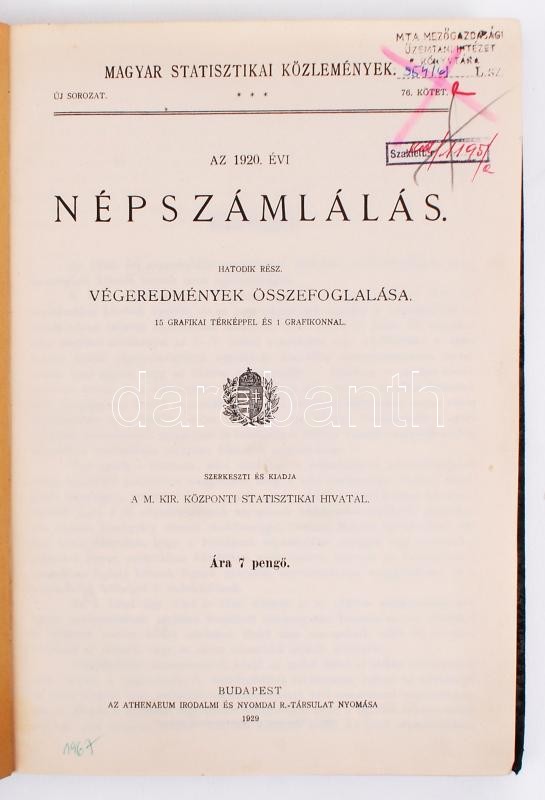 Magyar Statisztikai Közlemények: Az 1920 évi népszámlálás. Bp., 1920 A... https://www.darabanth.com/hu/193-Gyorsarveres/193.0/Festmeny-mutargy-papirregiseg-egyeb/Konyvek-Tortenelem~200026/Magyar-Statisztikai-Kozlemenyek-Az-1920-evi-nepszamlalas-Bp-1920-Athenaeum-Egeszvaszon~II735603