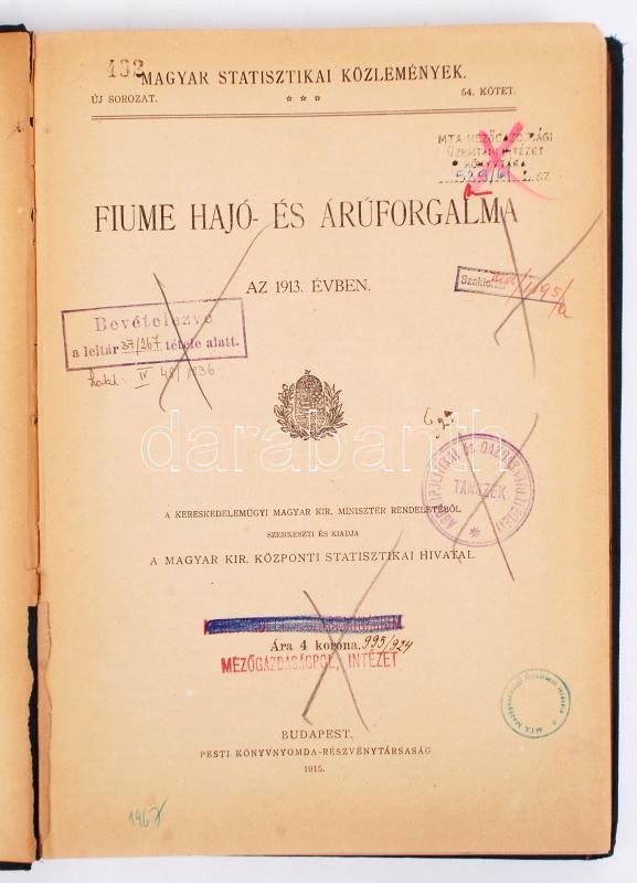 Leírás: Magyar Statisztikai Közlemények: Fiune hajó- és áruforgalma. Bp., 1915 Athenaeum. Egészvászon kötésben