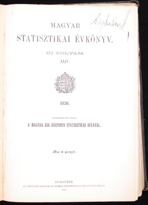 Magyar statisztikai évkönyv. Új folyam. XLIV. 1936. Bp., 1937, Magy. K... https://www.darabanth.com/hu/193-Gyorsarveres/193.0/Festmeny-mutargy-papirregiseg-egyeb/Konyvek-Tortenelem~200026/Magyar-statisztikai-evkonyv-Uj-folyam-XLIV-1936-Bp-1937-Magy-Kir-Kozponti-Statisztikai-~II706354