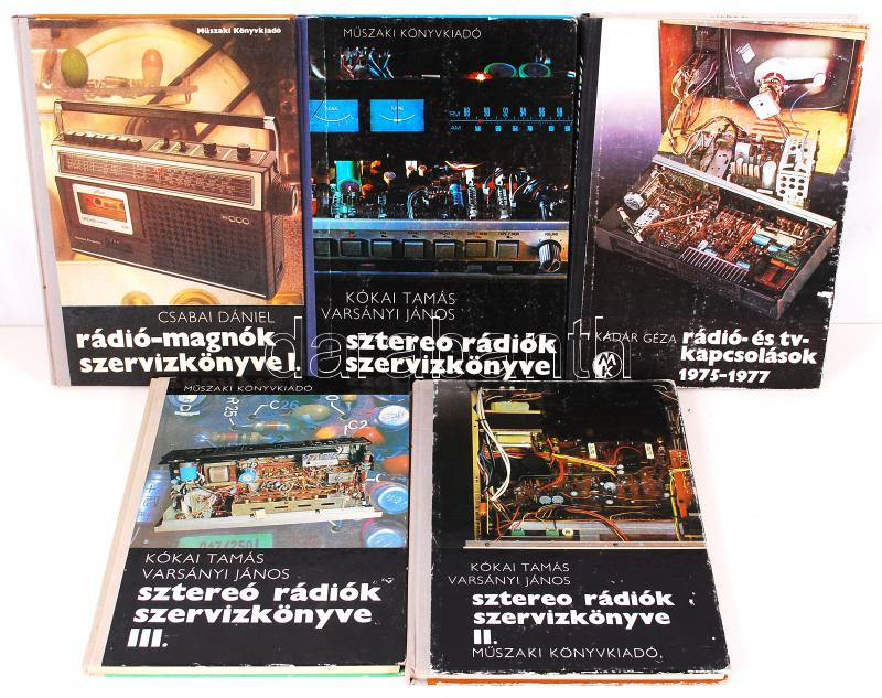 5db rádióval és TV-készülékkel kapcsolatos könyv: Sztereo rádiók szervizkönyve I-III; Rádió- és tv-kapcsolások 1975-1977; Rádió-magnók szervizkönyve I.