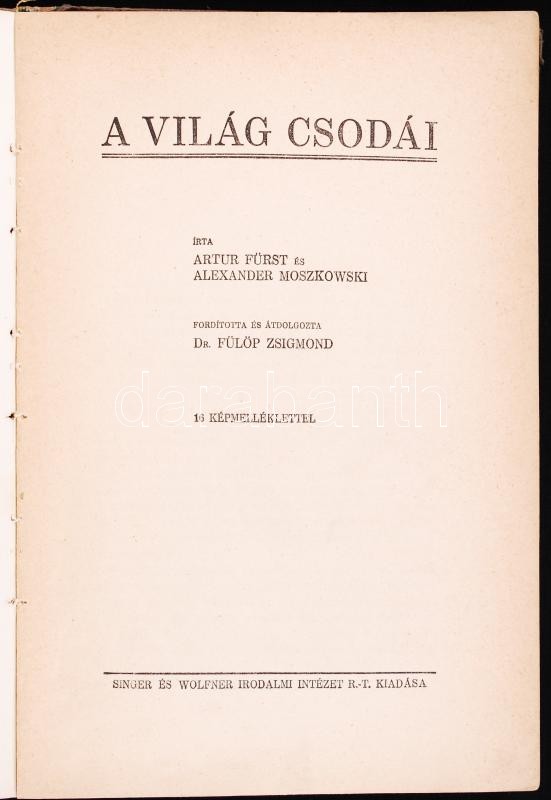 Artur Fürst - Alexander Moszkowski: A világ csodái. Ford. Dr. Fülöp Zsigmond. 16 képmelléklettel. Bp., é.n., Singer és Wolfner. Kiadói félvászon kötésben (kötés levált, néhány lap kijár, a szövegben egy-két tollas aláhúzás)