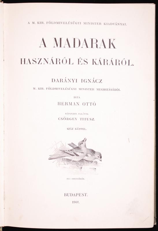 Herman Ottó: A madarak hasznáról és káráról. Darányi Ignácz m. kir. földmivelésügyi minister megbízásából. 105 képpel. Képekkel ellátta Csörgey Titusz. Második, bővített kiadás. Bp., 1904, A m. kir. földmivelésügyi miniszter kiadványa. 279p. Kiadói egészvászon kötésben, aranyozott lapszélekkel