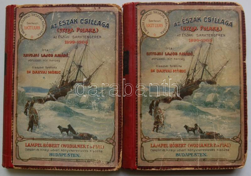 Magyar Földrajzi Társaság Könyvtára: Savojai Lajos Amádé - Az Észak csillaga: Az északi sarktengeren 1899-1900, I-II. 207 kép, 24 melléklet, 2 panoráma és 3 térkép. Bp, é.n., Lampel R. Kiadóvállalata. Kiadói félvászon kötésben, kissé megviselt állapotban