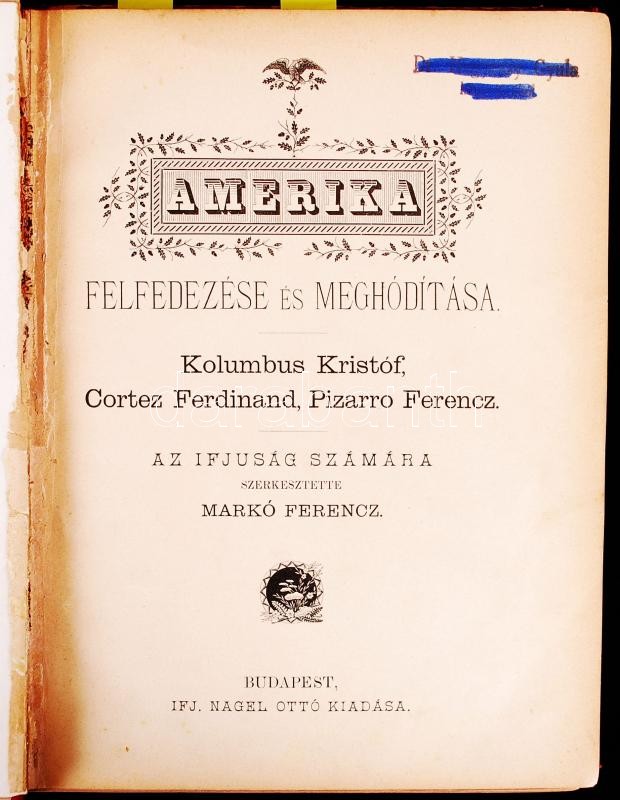 Leírás: Markó Ferencz (szerk.): Amerika felfedezése és meghódítása. Kolombus Kristóf, Cortez Ferdinand és Pizzaro Ferencz Bp., é.n. Nagel Ottó. 3 db litho képpel (kijárnak). Félvászon kötésben, litho címlappal