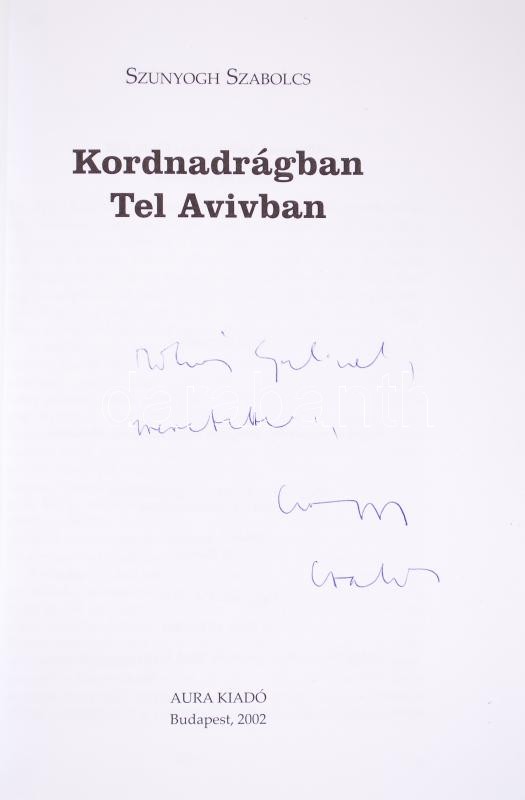 Szunyogh Szabolcs: Kordnadrágban Tel Avivban. Dedikált! Bp., 2002. Aur... https://www.darabanth.com/hu/193-Gyorsarveres/193.0/Festmeny-mutargy-papirregiseg-egyeb/Konyvek-Utazas-varosok~200027/Szunyogh-Szabolcs-Kordnadragban-Tel-Avivban-Dedikalt-Bp-2002-Aura~II658427