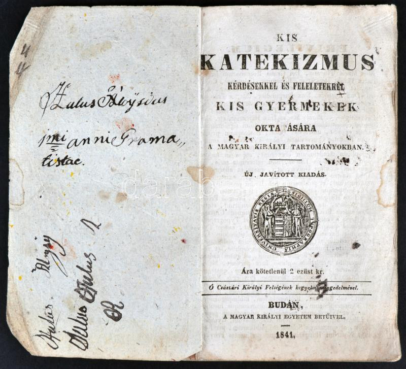 Kis katekizmus kérdésekkel és feleletekkel kis gyermekek oktatására a magyar királyi tartományokban. Új, javÃtott kiadás. Budán, 1841, a Magy. Kir. Egyetem betűivel. Korabeli papÃrborÃtóban, belsÅ‘ oldalán bejegyzésekkel