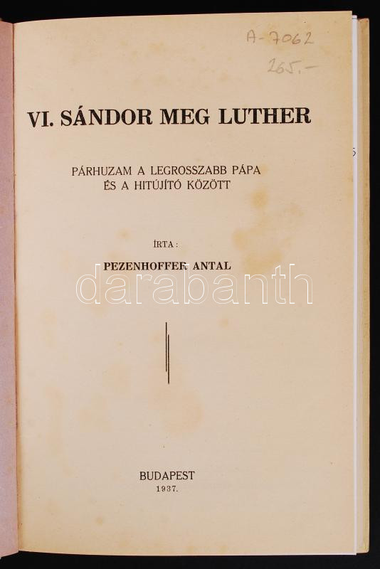 Leírás: Pezenhoffer Antal: VI Sándor meg Luther. Budapest 1937. Az író saját kiadás.