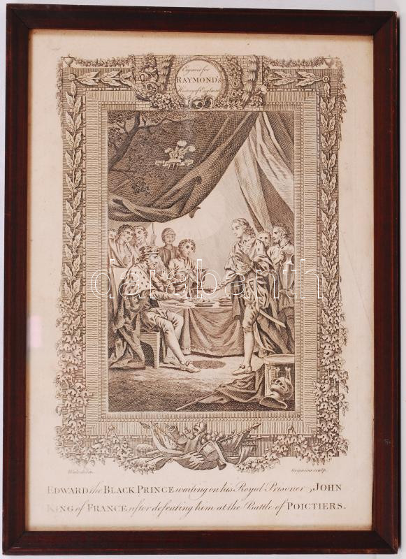 1770-1800 Waledelin - Grignion sculp.: "Edward the Black Prince waiting on his Royal Prisoner John King of France after defeating him at the Battle of Poictiers - Engraved for Raymond's History of England". Rézmetszet, papír, jelzett, üvegezett keretben /